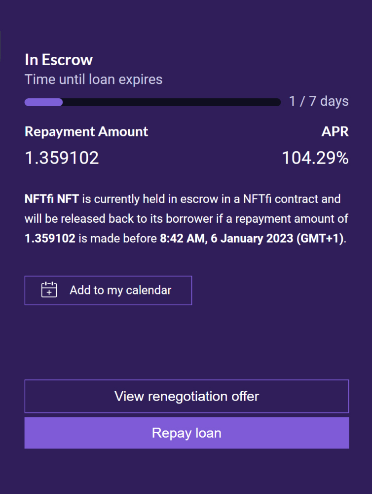 5. Confirm the transaction in your wallet. This will transfer your NFT to the NFTfi escrow contract and credit the loan amount to your wallet.